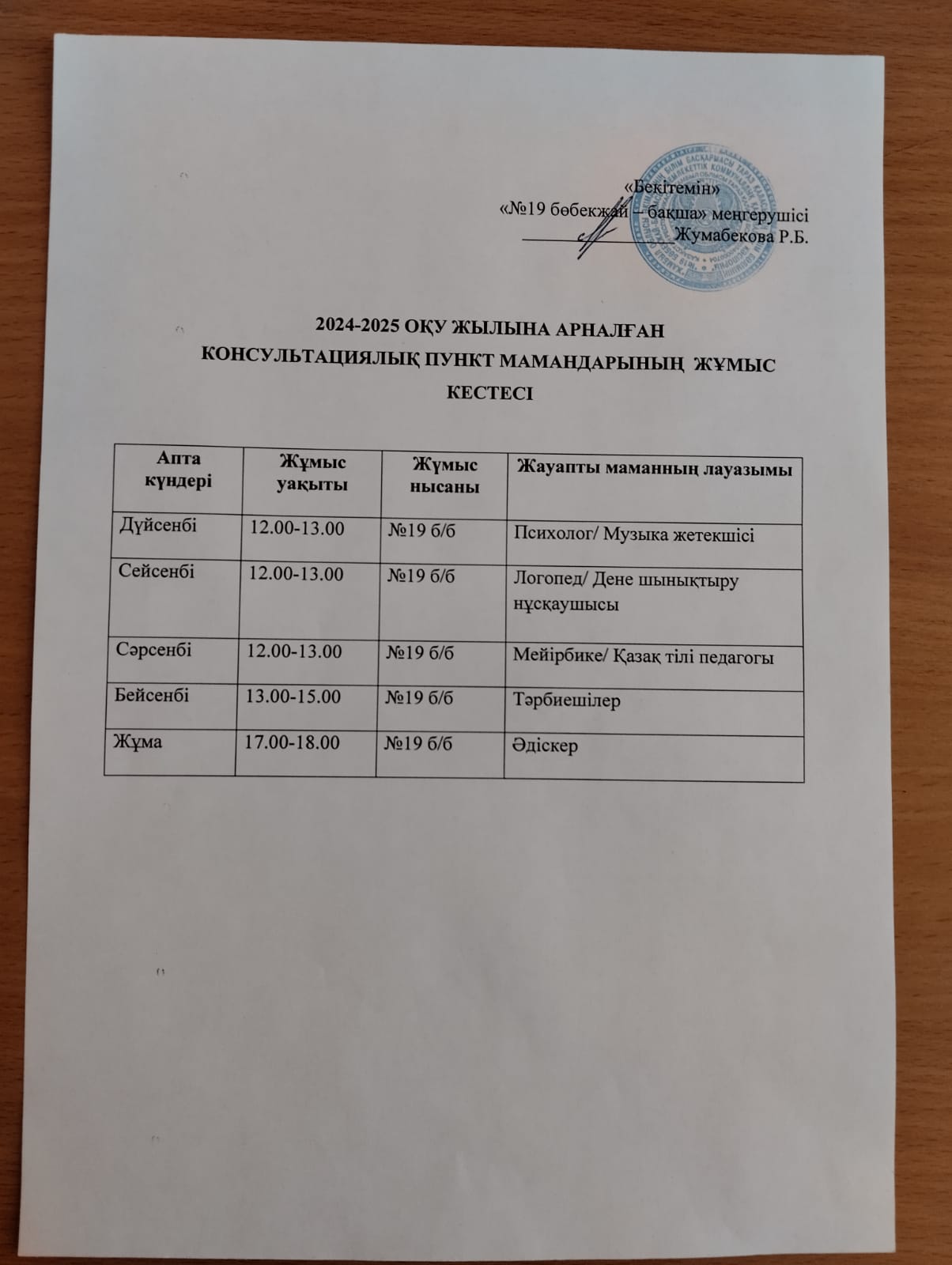 Консультациялық пункт мамандарының жұмыс кестесі » №19 бөбекжай-бақшасы