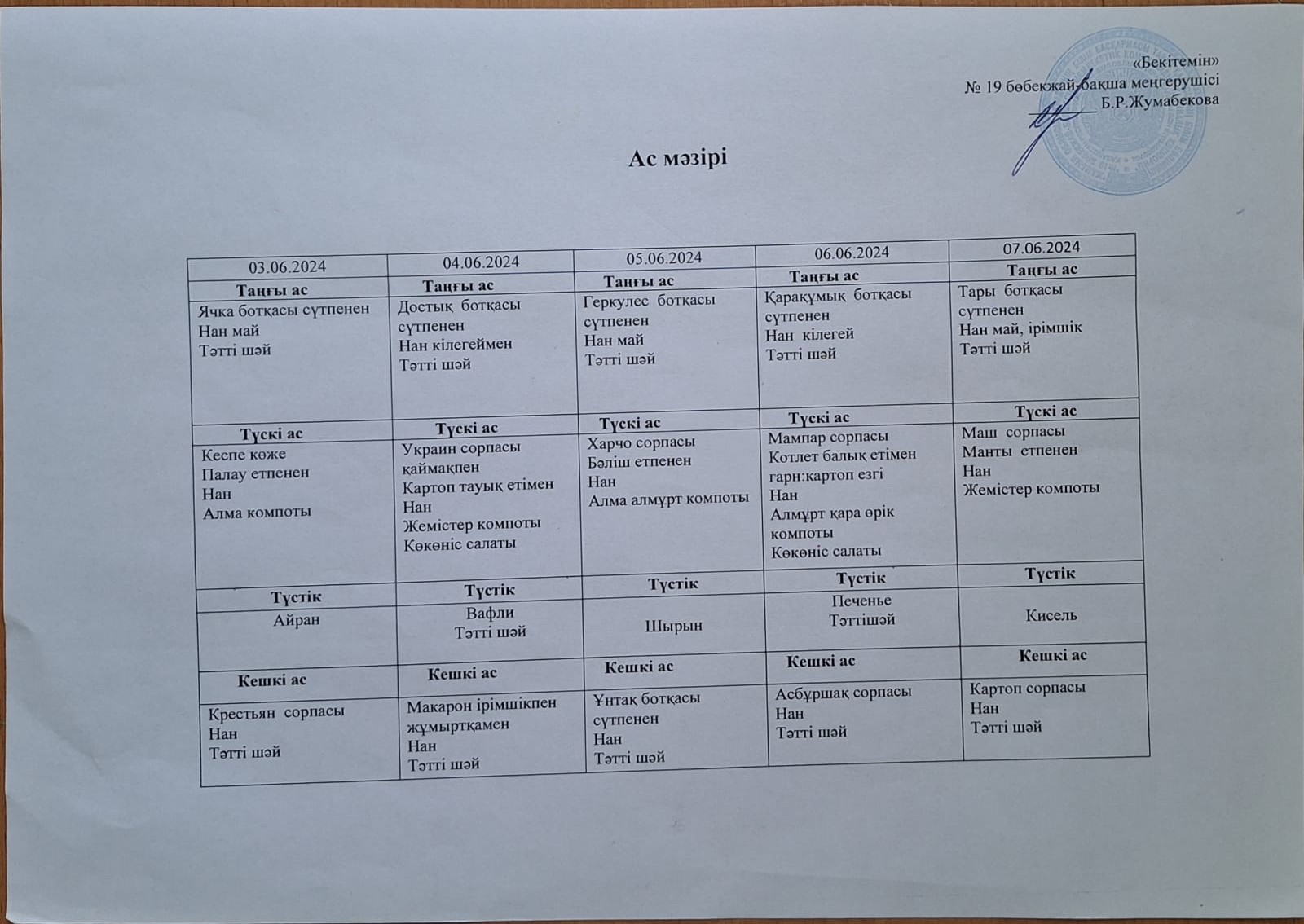 Маусым айы 2024 ж. Бес күндік ас мәзірі » №19 бөбекжай-бақшасы