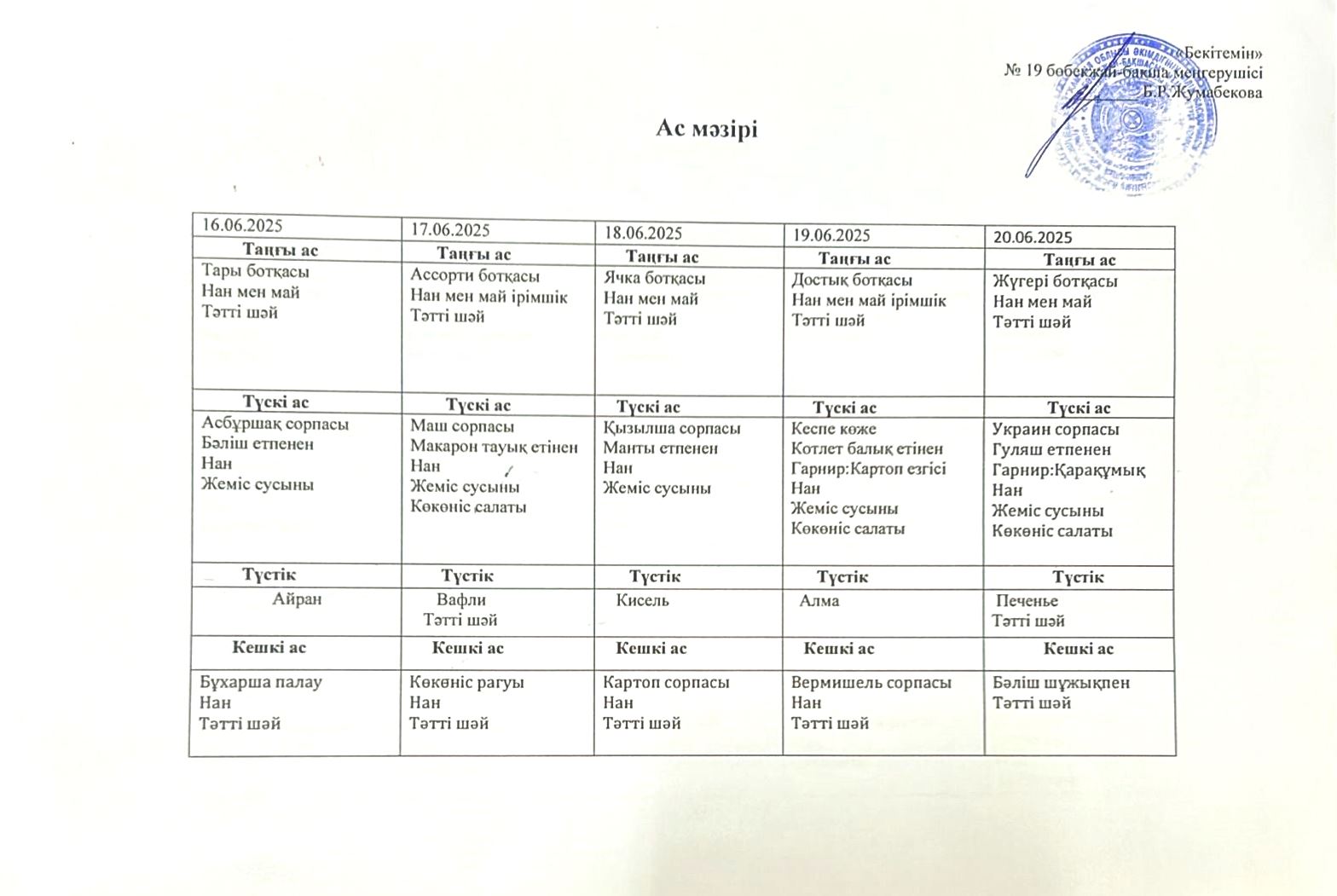 Маусым айы 2025 жыл. Бес күндік ас мәзірі » №19 бөбекжай-бақшасы
