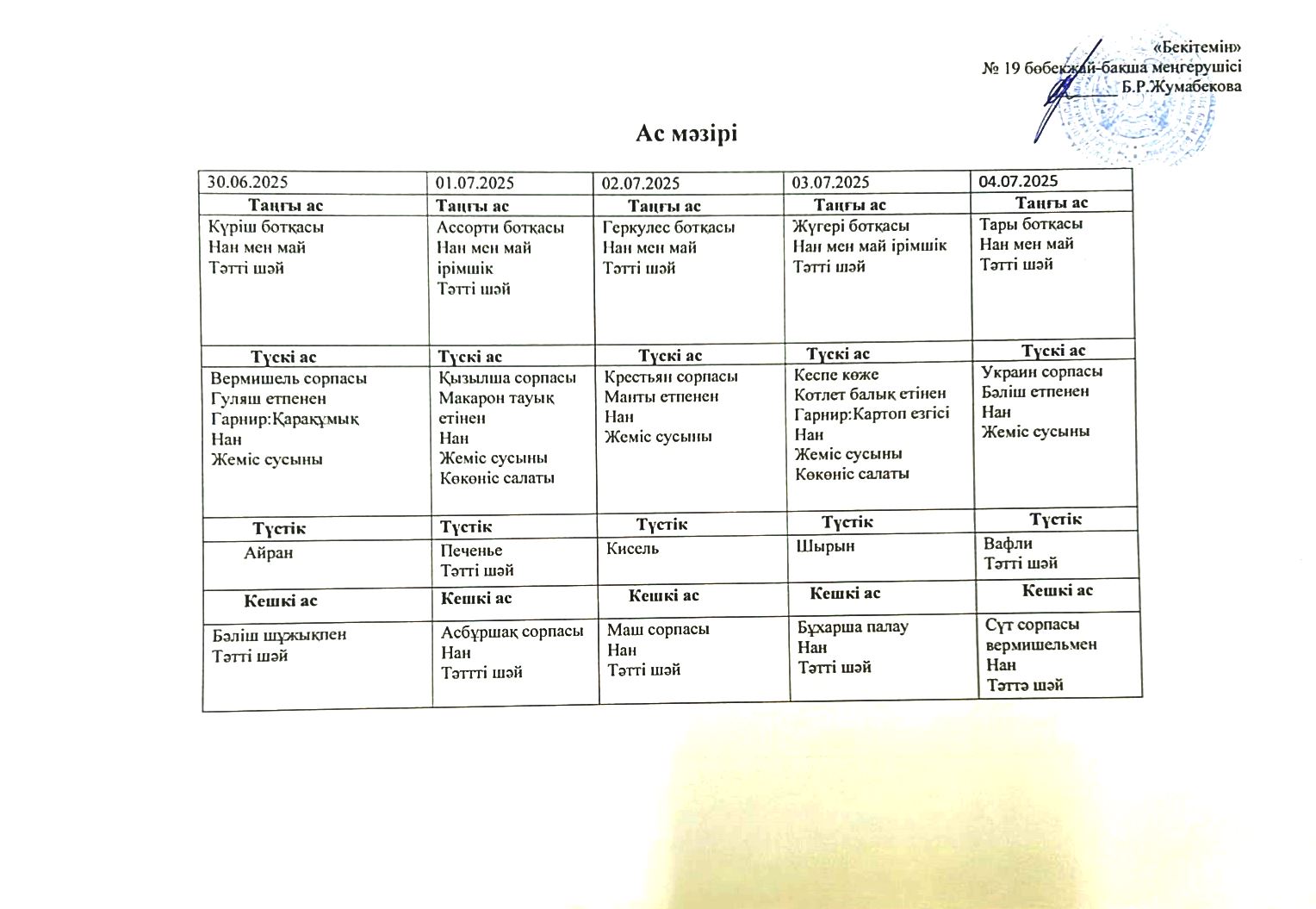 Маусым айы 2025 жыл. Бес күндік ас мәзірі » №19 бөбекжай-бақшасы