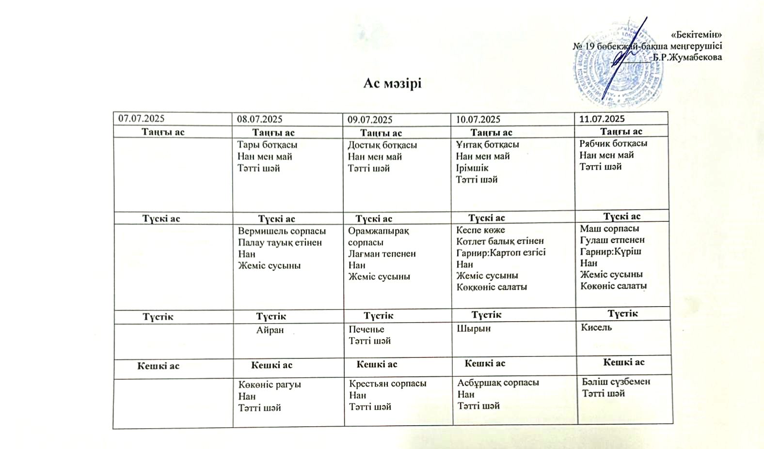 Шілде айы 2025 жыл. Бес күндік ас мәзірі » №19 бөбекжай-бақшасы