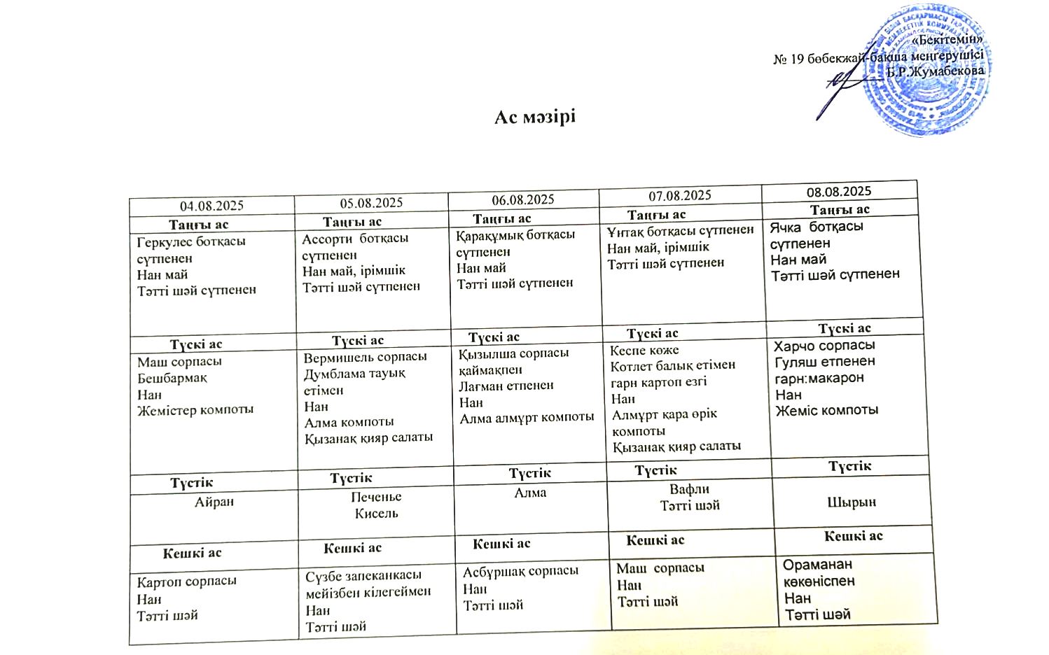 Тамыз айы 2025 жыл. Бес күндік ас мәзірі
