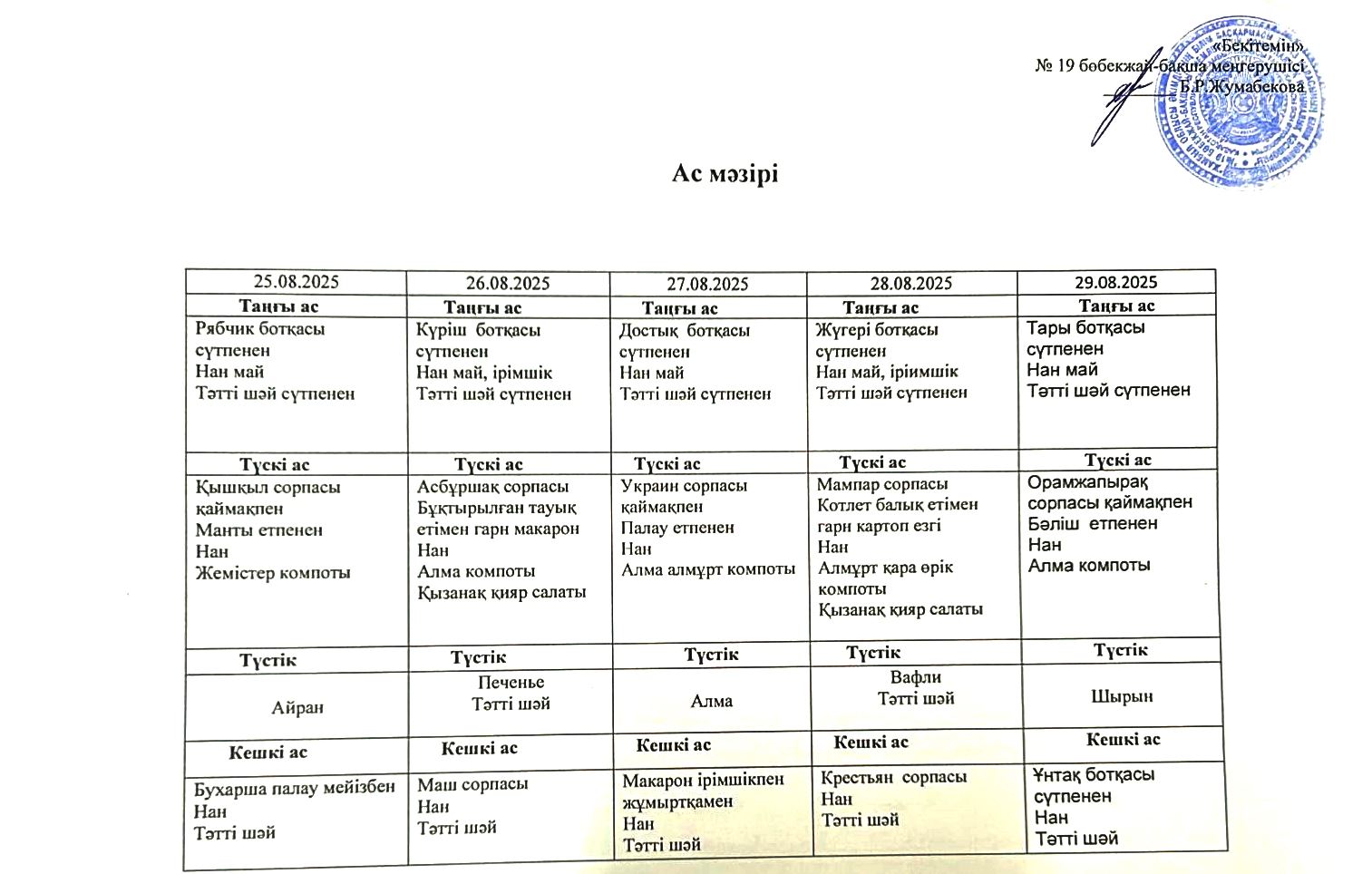 Тамыз айы 2025 жыл. Бес күндік ас мәзірі