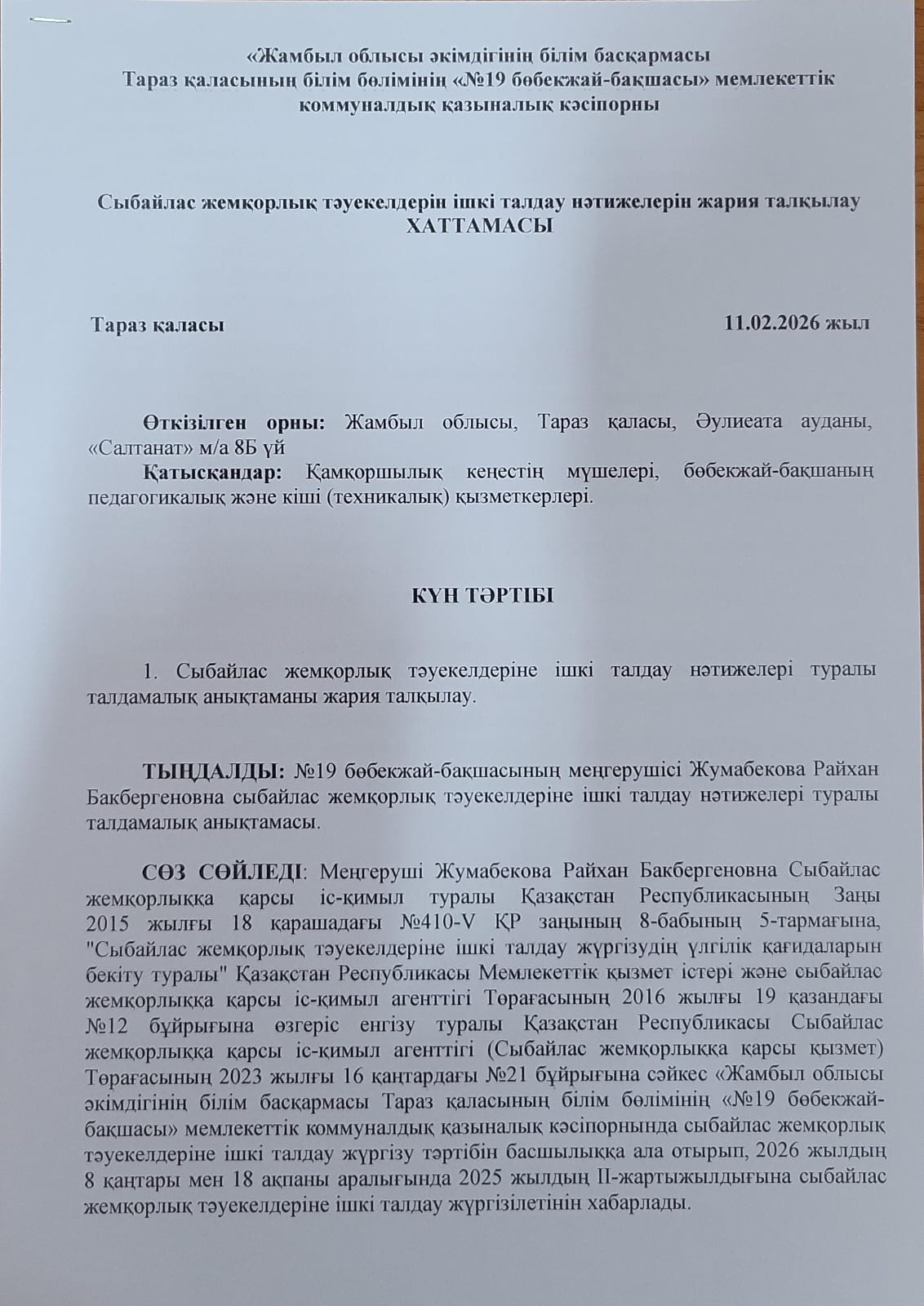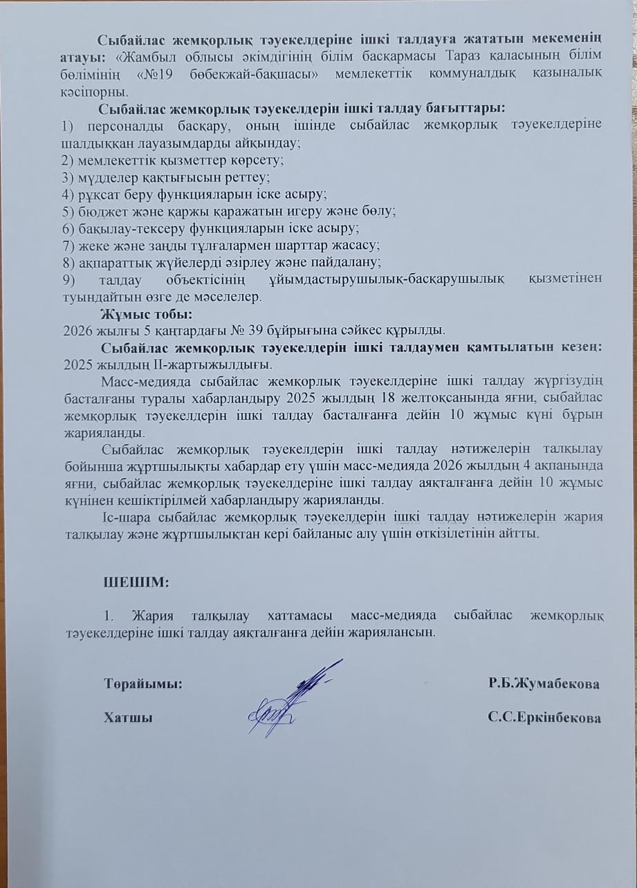 Сыбайлас жемқорлық тәуекелдерін ішкі талдау нәтижелерін жария талқылау ХАТТАМАСЫ » №19 бөбекжай-бақшасы