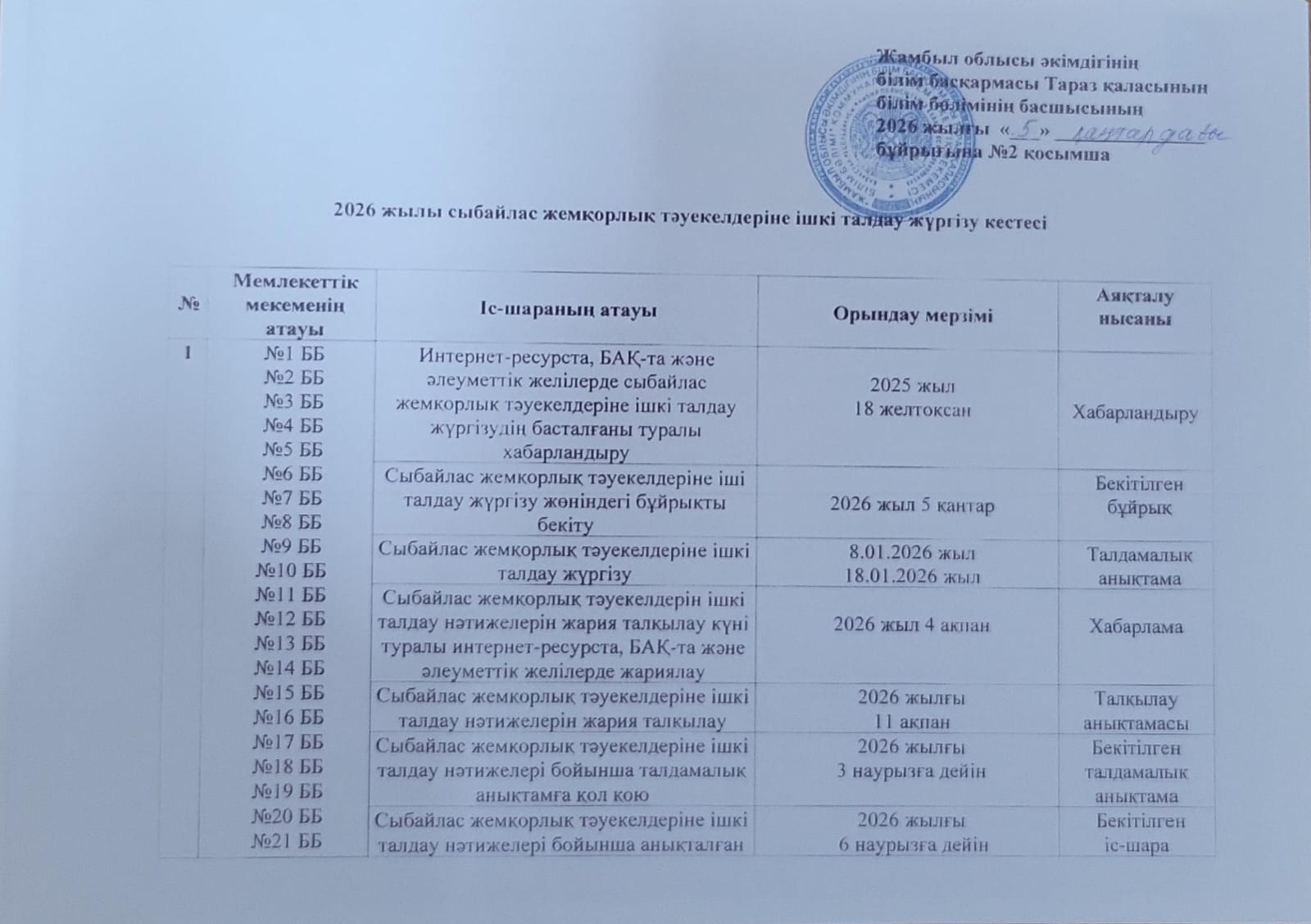 » » Сыбайлас жемқорлық тәуекелдеріне ішкі талдау жүргізу туралы бұйрық пен жоспар БІЛІМ БӨЛІМІ