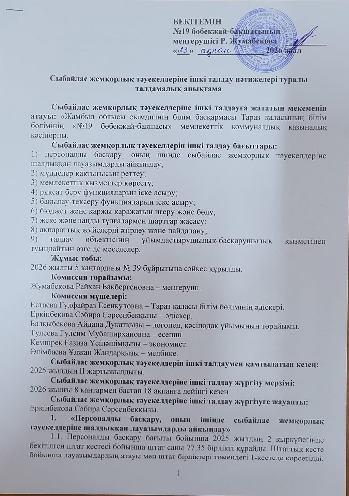Сыбайлас жемқорлық тәуекелдеріне ішкі талдау нәтижелері туралы талдамалық анықтама » №19 бөбекжай-бақшасы