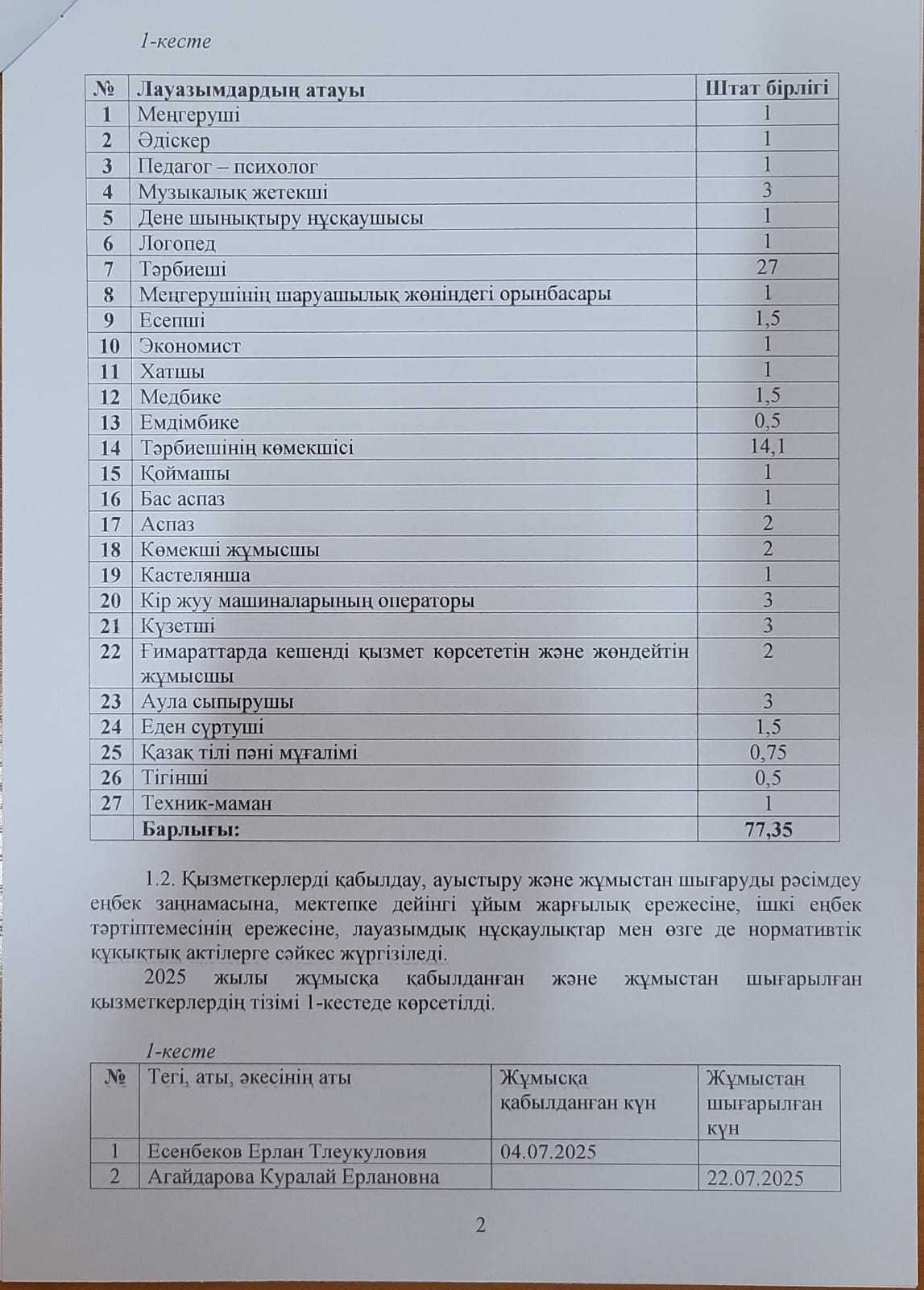 Қабылдау бөлімі :