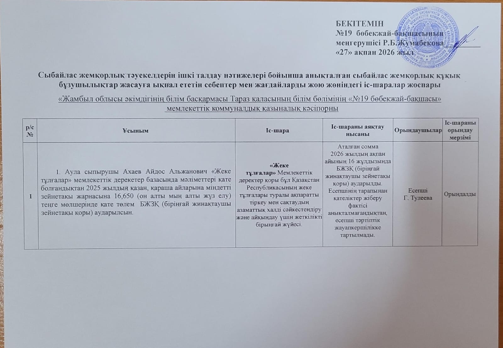 Сыбайлас жемқорлық тәуекелдерін ішкі талдау нәтижелері бойынша анықталған сыбайлас жемқорлық құқық бұзушылықтар жасауға ықпал ететін себептер мен жағдайларды жою жөніндегі іс-шаралар жоспары » №19 бөбекжай-бақшасы