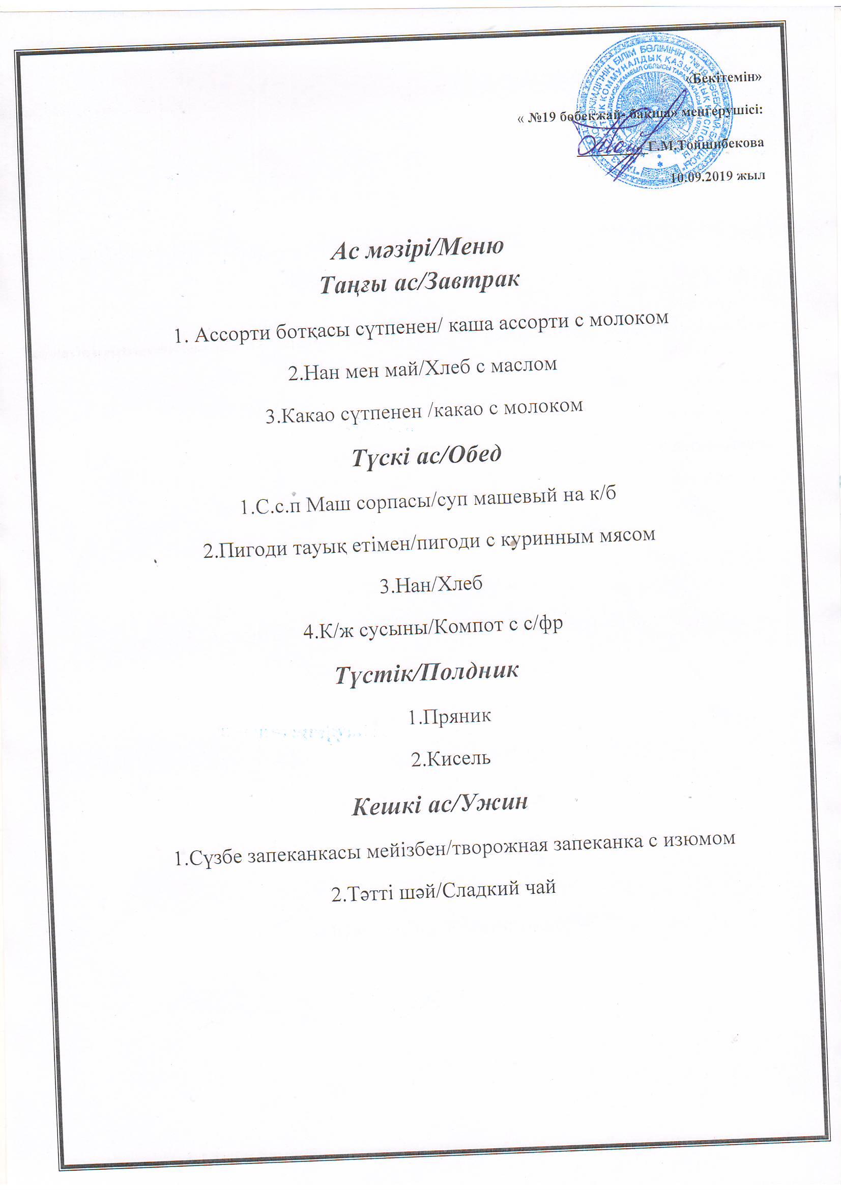 Ас мәзірі 10.09.2019 ж. » №19 бөбекжай-бақшасы